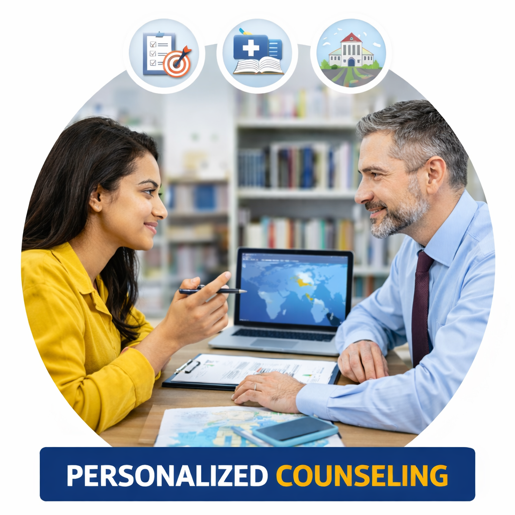 We understand that studying medicine abroad is a life-changing decision. That’s why our experienced counsellors provide personalized guidance—from choosing the right university and country to completing documentation, visa processing, travel arrangements, and post-arrival support. Our strong network with globally recognized medical universities ensures a smooth and reliable admission experience for every student.